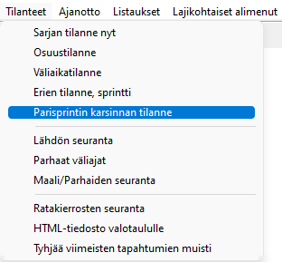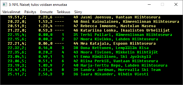 Tähän on tullut nyt versiosta 10.1.3 alkaen lisää älyä. Alla ensin vanha, vähemmän älyä sisältävä toiminta, alempana sitten älykkäämpi ennustaminen. Jos sarjan nimen perässä on teksti tulos voidaan ennustaa, sarjassa on väliaikapisteitä tai kierroslaskentaa, joiden perusteella urheilijan lopputulosta voidaan ennustaa.
