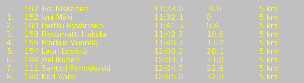 Kisaa voi seurata myös videokuvan päälle tulostettavalla striimaus-grafiikalla. Siitä on tarkempi selvitys täällä. Lyhyesti kerrottuna striimauksessa valitaan radan paikka, esim. maali, jota lähestyvää urheilijaa seurataan. Seurannassa näytettävät tiedot voidaan valita urheilijan tiedoista, esim sija, nro, nimi ja tulos. Eroaika sarjan sen hetkikseen johtajaan lasketaan puolen sekunnin välein. Tuossa mallikuvassa Iivolla on 9 sekuntia aikaa mennä 5 km väliaikapaikassa kärkeen. 10 sekuntia myöhemmin Jonin rivi häviää ja Iivon ajasta poistuu miinusmerkki ja 9. sijalla oleva nousee listalle. Kilpailija saadaan seurantaan antamalla hänen numeronsa ja välittömästi S-kirjain numeron perään ja lopettamalla syöttö enterillä. Kirjaimen S muistaa sanasta Seuraa. |