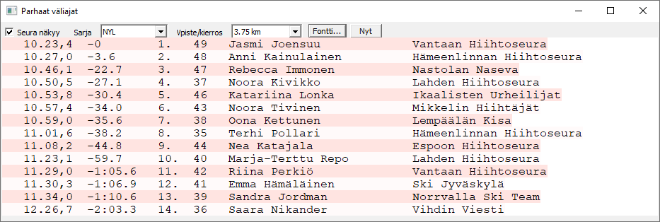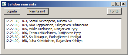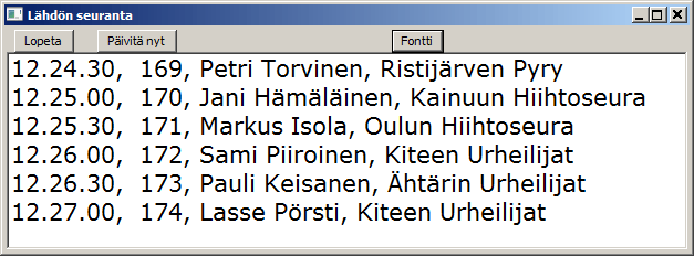 Sarjaa ja väliaikapistettä voidaan vaihtaa annettujen vaihtoehtojen mukaan. Mikäli sarjassa ei ole väliaikapisteitä määritetty, ei pisteitä voida valita. Tekstin fonttia voidaan muuttaa -napin avulla. Valittu fontti, ikkunan paikka ja koko säilyvät, vaikka ikkuna välillä suljetaankin. Kuvassa fonttina Courier New koossa 12 pistettä. Ottamalla rasti pois -ruudusta näytön vaatima tila pienenee. -napilla saat aina uusimman tilanteen, vaikka eihän sitä juuri tarvita. |