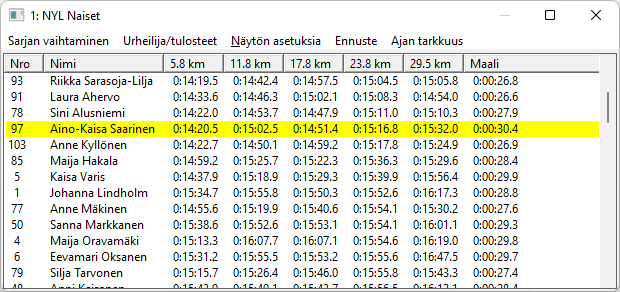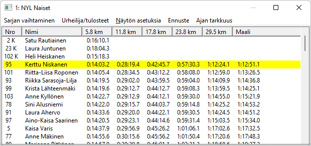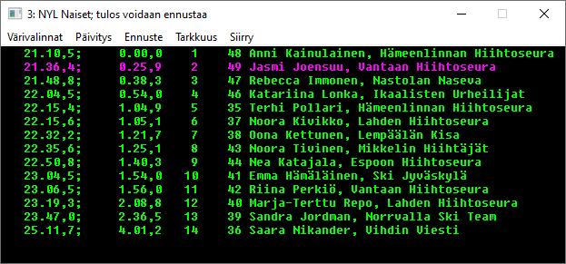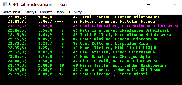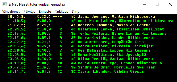 Näytön menusta löytyy sarjojen valinnat, ja vaihtavat sarjaa kilpailujärjestyksessä. Näytön paikkaa ja kokoa voidaan muuttaa ja sen alareunassa on lossi ja oikeassa reunassa hissi sopivan näyttökohdan paikalleen saamiseen. Pikanäppäimet ja vaihtavat näytön kilpailujärjestyksessä edelliseen ja seuraavaan sarjaan. Listassa ovat sarjan kilpailijat halutussa järjestyksessä. Järjestystä vaihdetaan klikkaamalla listan sarakeotsikoita. Samaa saraketta toistamiseen klikkaamalla järjestys vaihtuu suurimmasta pienimpään ja päinvastoin. Ylimmässä kuvassa on klikattu väliaikakohtaa 11.8 km. Kun kilpailijan numeron perässä on jokin kirjain, on kilpailijalle merkitty erityinen tilannetieto. Kilpailija numero 102, Heli Heiskanen on merkitty keskeyttäneeksi (K), koska hänellä on vain 5.8 km kohdalta väliaika. Näyttö ei päivity automaattisesti, koska en halunnut kuuluttajan joutuvan hyppimään riviltä toiselle tilannetta lukiessaan. Valitsemalla näytössä toinen urheilija koko näyttö päivittyy uudelleen ja siihen tulee uusia väliaikoja. Pikanäppäin CTRL+U tekee saman. Kun esimerkin näytössä tuplaklikataan Kerttu Niskasen riviä, saadaan esiin Kertun kilpailijakortti, jos vaikka seura tai syntymävuosi tai FIS-koodi halutaan tietää. Valikosta löytyy myös apua. Tästä näytöstä päästään tietoja myös muuttamaan, vaikkapa lisäämään puuttuva väliaika, mutta se ei ole kuuluttajan hommaa. Menun toiminnolla saadaan näyttö, jossa valitun kilpailijan (Aino-Kaisa) väliaika on nollaa ja muiden sitten suhteessa tähän, miinukset parempia ja plussat huonompia väliaikoja. Alempi kuva, siinä näkyy kiihtyykö vai hidastuuko vauhti matkan edetessä. Vastaava keinukytkin on toiminto . Kun Control-nappia ja E-kirjainta painetaan yhtäaikaa näyttöön vaihtuu väliaikapisteiden välinen aika, seinäkelloaika väliaikapisteessä ja takaisin normaaliin kumulatiiviseen väiiaikaan. Alin kuva. Oikean yläkulman X-rasti sulkee sitten näytön normaaliin windows-tapaan ja voidaan siirtyä muihin vaiheisiin kisan seurannassa. |