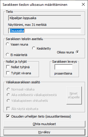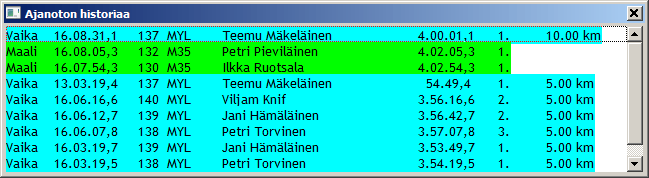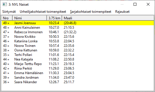 toiminto tietenkin päivittää antamasi muutokset extime.ini-tiedostoon seuraavaa kisaa varten. Ja vaihtaa urhelijoiden tulostukseen käytetyn fontin. Tasaväliset fontit (Courier New) ovat luettavampia.