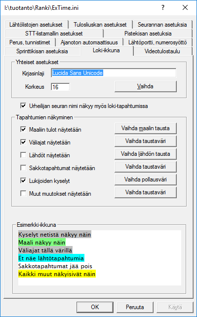 Vuoden 2013 syksyllä täydensin loki-ikkunaa niin, että eri tapahtumat saadaan näkyviin omalla taustavärillään kuten varsinaisessa ajanoton näytössäkin. Pitämällä tätä ikkunaa auki voi kuuluttaja varmistua siitä, että jokainen maaliin tulija kuulee oman aikansa ja sijoituksensa maaliin tullessaan. Ikkuna avataan valikosta löytyvät alimenun avulla. Eri tapahtumalajien räätälöinti tehdään -valikon välilehdellä. Loki-ikkuna tulee näytön alareunaan sen koko pituudelta, mutta sen kokoa ja paikkaa voi vapaasti muuttaa. Jos loki-ikkuna oli edellisen kerran auki lisänäytöllä, ExTime varmistaa avatessaan ikkunaa, onko lisänäyttö nyt käytössä ja auki. |