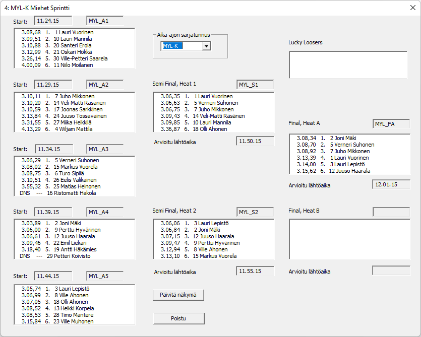 Sarja valitaan kohdassa näkyvistä sarjatunnuksista, vain aika-ajon sarjat ovat listassa mukana. Vasemassa reunassa ovat alkuerien tilanteet. Jos erä on jo kilpailtu, siinä näkyy urheilijan tulos, sijoitus, numero ja nimi. Muussa tapauksessa näkyy urheilijan ajan tilalla lähtörata. Kunkin alkuerälistan yläpuolella näkyy erän lähtöaika, joko toteutunut tai aikataulutettu. Keskiosassa ovat välierät ja oikeassa reunassa finaalit, tilaa on varattu myös harvoin kilpailtavalle B-finaalillekin. Oikealla ylhäällä näkyy Lucky Loosers tilanne, esimerkissä heitä ei ole, koska kisa on jo ohitse. Näyttö ei päivity itsessään, vaan vasta kun se on näytön käyttäjän kannalta sopivaa. Alaosan nappi on juuri sitä varten hänelle tehty. |