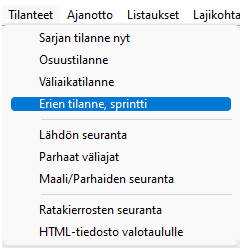 Sprintin seurantaa varten ExTimessä on oma näyttö, jossa näkyy valitun sarjan erien tilanteet. Näyttö avautuu -valikon kohdasta . Näyttö voi olla auki samanaikaisesti muiden ikkunoiden kanssa, mutta vain yhdestä sarjasta kerrallaan. Näytössä itsessään on toiminto sarjan vaihtamiseksi. |