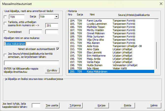 Oikealla esimerkki ilmoittautumisesta, jossa tarvitaan vain urheilijan nimi ja Enter-painallus. Sarja pidetään ennallaan, ExTimen annetaan huolehtia numeron kasvatuksesta, tunnistimia eikä yhteisöä tai seuran nimeä käytetä. Uusi kilpailija saa aina sarjan suurimman lähtönumeron. Kilpailija tulee mukaan kilpailuun myös -napin painalluksella ja ilmestyy samalla oikealla puolella näyttöä olevaan ilmoittaumispisteen tapahtumahistoriaan. Juuri lisätyn urheilijan nimi on valittu (sinisenä), joten se korvautuu automaattisella seuraavalla kirjaimella, joka näppäimistöltä annetaan. Nopeaa kirjoitusta siis. Ja kun oli rastittuna, ExTime korjasi isot etukirjaimet ja tarpeettomat välityhjät. Voit siis kirjoittaa kaiken pienillä kirjaimilla, kuten tein tuossa esimerkissä Kaisan sukunimelle. |