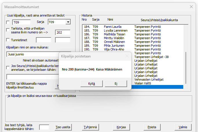 -nappi poistaa oikean puolen listasta valitun kilpailijan. Toki poistolle ExTime haluaa varmistuksen, ettei lipsahduksia pääsisi tapahtumaan. Karsina=244 oheisessa esimerkissä tarkoittaa, että Kaisa lisättiin kisaan 244. kilpailijana, lisäys menee aina kisatiedoston viimeiseksi. -nappi tyhjää ilmoittautumishistorian, mutta hakee tilalle valittuna olevan sarjan kaikki ilmoittautuneet kilpailijat. Kun vaihdat sarjaa, niin saat tällä toiminnolla näkyviin tähän sarjaan jo ilmoitetut kilpailijat. Painamalla nappia voidaan listalta valitun kilpailijan tietoja muuttaa, tarpeen, jos nimi meni väärin tai varoituksistani huolimatta kilpailunumeroissa sähelletään. -napilla lopetetaan ilmoittautumisten käsittely, sitä voidaan aina jatkaa taas tekemällä menusta uudelleen -valinta. |