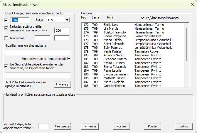 Kilpailunumero kasvaa aina yhdellä jokaisen ilmoittautumisen jälkeen. Kilpailunumero ei myöskään voi olla sama kuin aikaisemmin kilpailuun jo ilmoitetun kilpailijan numero. Jaettavien numerolappujen on siis syytä olla järjestyksessä ja kadonneet laput selvästi merkittynä, jotta jokainen kilpailija saa todella sen numeron, joka ohjelmalle annetaan. Helppoa, jos yhdessä pisteessä käsitellään vain yhtä sarjaa. Muuttuvat kentät ovat tietysti sitten henkilön nimi ja seura, ne on joka kerta annettava. Samoin voidaan rastia myös aina uudelleen ne muut kilpailusarjat, joihin tällä kilpailusuorituksella osallistutaan. Jos kisassa käytetään sähköistä tunnistinta, on sen numerolle myöskin oma kenttänsä. Näytön alaosassa on nappi ja sen eteen kappalemäärä ruutu, kuinka monta uutta lisätään annettuun sarjaan annetulla nimellä ja yhteisön nimellä. |