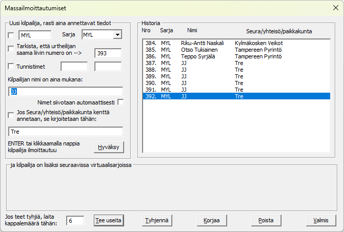 Joskus voi olla tarpeen perustaa kilpailuun urheilijoita, joiden nimeä ei vielä tiedä. Tämä voi myös helpottaa nappula- tai iltakilpailujen ruuhkaa, jolloin nimien kirjailua voidaan tehdä kisan ollessa käynnissä. Oheisessa esimerkissä olen laittanut sarjaan MYL 6 kilpailijaa oletus nimellä JJ (Jaska Jokunen) ja seuran nimeen kirjoitin Tre. Tämän jälkeen laitoin näytön alaosan vasempaan ruutuun kappalemääräksi 6 ja painoin nappia . Ja kun nimiä ei siivota, JJ säilyi, eikä muuttunut Jj:ksi. Lopputulos näkyy oikealla, sarjaan MYL tuli 6 kappaletta samannimisiä urheilijoita alkaen sarjan viimeisestä numerosta 387. Näille laitan sitten kisan aikana heidän oikeat nimensä ja tarvittaessa myös vaihdan heidät oikeaan sarjaan. Nappulakisoissa ja seuran iltakisoissa ei kai arvonnalla ole suurta merkitystä, kaikki saavat lähteä siinä järjestyksessä kuin he numerolappunsa saavat. Vai ? |