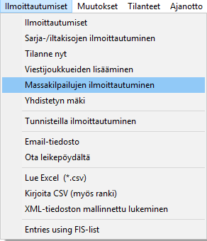 Massailmoittautumisissa ei tarvitse sarjoille antaa etukäteen lähtöaikaa, lähtövälin voin kyllä laittaa nollaksi, mutta se ei ole pakollista. Kilpailijoiden lähtöjärjestystä ei myöskään tarvitse arpoa, silloinhan annetut numerot menisivät sekaisin.