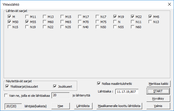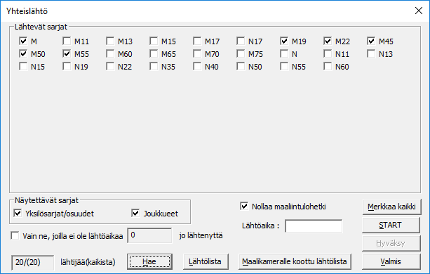 ExTimen menun viimeisenä komentona on . Tämän toiminnon avulla rastitaan yhtäaikaa lähtevät sarjat, esimerkissä M, M19 - M55, napilla nähdään kilpailijoiden määrä ja sitten vain odotellaan sarjojen lähtölaukausta. Lukumäärän 20/(20) ensimmäinen luku ilmoittaa, monta todella pitäisi olla lähtöviivalla poisjääneet huomioiden ja jälkimmäinen luku kertoo, monta näihin sarjoihin oli alunperin ilmoitettu. Jos sarjoissa on jo väliaikalähdöllä lähteneitä ja loput urheilijat aiotaan lähetettää yhteislähdössä, on rastittava kohta . Silloin ei lähteneiden lähtöaikaa enää muuteta. Jo lähteneistä ExTime kyllä varoittaa. Napilla saadaan : ruutuun todellinen lähtöaika, sitä nappia siis klikataan, kun savu pöllähtää lähettäjän pistoolista. Vaihtoehtoinen tapa on painaa kellolaitteen nappia, ExTime siirtää silloin sen ajan Lähtöaika-ruutuun. Toki aikaa voi korjata käsin, jos sattui ajanotossa nukahtaminen. Mutta jos ajanotossa hätäiltiin, niin korjata ei tarvitse, seuraava napin painallus korvaa entisen lähtöajan. |