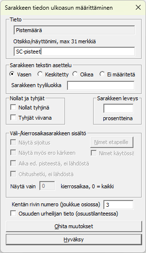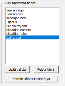 , sen ruuduissa Rivi ja Sarake Samalla rivillä olevat tiedot tulostetaan annetussa sarakejärjestyksessä. Ja aina pitää muistaa, että sarakenumerot ovat välillä 1 - 16 ja tietyt kaksi saraketta (Vaihtoajat ja Sakkoja ansaittu), jos ovat mukana joukkueosiossa, toistuvat joka rivillä alekkain aina samalla sarakkeella. |