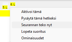ExTimen työkalujen ikoniriville ilmestyy jokaista käynnissä olevaa live-tulostusta kohti keltainen tai vihreä seurannan numero + L-kirjain. Keltainen tarkoittaa, että tulostus toimii, mutta tiedostoa ei siirretä web-palvelimelle (tai se ei onnistunut) ja vihreä neliö kertoo kaiken olevan kunnossa. Klikkaamalla hiiren oikealla näppäimellä seurannan numeroa, ExTime näyttää alimenun, josta voidaan poimia live-tulostukselle haluttu vaihtoehto. tekee välittömästi seuraavan online-tulosteen. Normaalistihan Online-tulos tehdään tietyn sekuntimäärän väliajoin, mutta vain, jos kilpailijatietoihin on tullut muutoksia. valinnalla päästään säätämään mm. tulostukseen meneviä sarjoja tai tulostuksen aikaväliä, katso alla. |