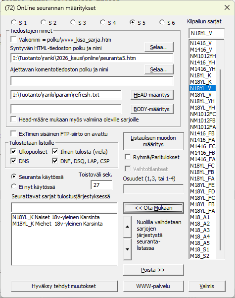 Oikeassa reunassa näkyvät kilpailun sarjat, niistä yksi kerrallaan valitsemalla ja napilla saadaan sarja mukaan seurantaan, vastaavasti seurattavien sarjojen listalta valitsemalla yksi ja painamalla -nappia se sarja poistuu seurannasta. Sarjojen keskinäistä järjestystä vaihdetaan , valittua sarjaa ylöspäin tai alaspäin siirtämällä. Ja ylimmän sarjan tunnus vaikuttaa siis syntyvän tiedoston nimeen, jos $SARJA$ maski on nimessä käytössä. Uhraa pieni hetki sen miettimiseen, minkä sarjan satunnainen selailija haluaisi nähdä ensiksi. Ja jos samaan seurantaan on tarkoitus laittaa monta eri sarjaa, kannattaako kaikki sarjat laittaa heti kilpailun alussa, vaiko vasta kisan kuluessa lisäillä seuraavia sarjoja seurantaan ja siihen ylimmäksi? ruudun avulla annetaan se aikaväli, kuinka usein html-tiedosto tehdään. Kaukana netissä oleva selailija arvostaa toimivaa tulostusta enemmän kuin epavakaata, viiden sekunnin välein tapahtuvaa päivityksen yritystä. Siis harvempi päivitysväli on luotettavampi. Uusi tiedosto kirjoitetaan ensin tilapäisnimellä ja valmis kopioidaan aina entisen päälle. Viesteissä, esimerkki oikealla, saadaan vaihtotilanne näkyviin, kun kohtaan laitetaan rasti ja siihen alapuoliseen ruutuun niiden osuuksien numerot, jotka halutaan mukaan. Listauksen malli näkyy Vaihtojen tilanteet (linkissä Keski-Pohjanmaan maakuntaviestin tilanne osuuden 6 lopussa). Osuusnumerot voidaan antaa yksittäin, malliin 1,2,3,4 tai välinä malliin 3-4 tai jopa näiden yhdistelmänä (1,5-7), kuten windowsin printtaa-ikkunassa määritetään printattavat sivut. Käyttäjän tulee itse huolehtia siitä, että tulostetaan vain viestisarjoista, osuuksien sarjoista ei vaihtotilannetta saada, niistä pitää ottaa normaalit osuusajat kuten tehdään henkilökohtaisissa sarjoissa. Osuuksien sarjoja ja viestisarjoja ei saa myöskään yhdistää samaan seurantaan. |