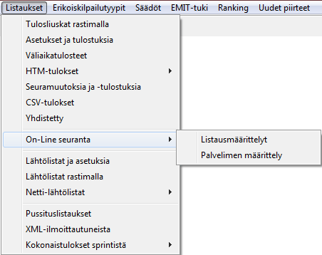 Onlinetuloksilla tässä tarkoitetaan ajastetusti tehtäviä sarjakohtaisia HTML-tuloksia, jotka siirretään netissä olevalle palvelimelle puhelimilla/tableteilla selaitaviksi. Ajastuksia voi olla käynnissä samaan aikaan kuusi (6) erilaista ja jokaisessa voi olla haluttu määrä sarjoja ja erilainen sivun ulkoasu. Määrittelyissä annetaan: