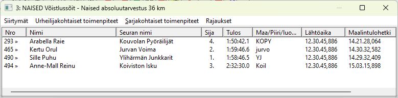 Tämä kaikki määritetään tutulla tavalla. Uutta on vain ja menujen joukkueita koskeviin alimenuihin tulleet kaksi riviä. joukkueen tietojen antamiseen ja urheilijan riville laitettavien tietojen antamiseen.