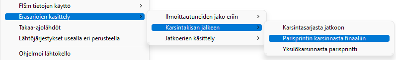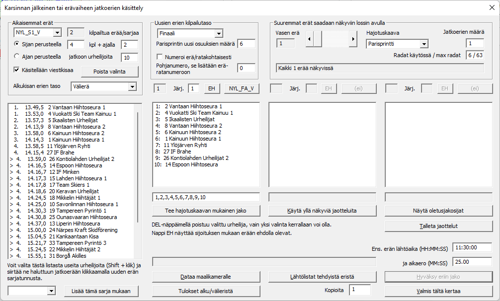 Valikon , kohdasta aukeavan alimenun näyttö on apuväline, kun jatkoon selviää joko puhtaan ajan perusteella tai sijoitukseen ja aikaan perustuen. -valikon näytöstä löytyy nyt useita välilehtiä, joista yhden nimenä on . Parisprinttiin on vaikutusta Erän tason tunnuskirjaimilla sekä varsinkin alueella annettavat tiedot Sijan perusteella ja lisäksi aikojen perusteella. Toki näitä ohjetietoja pääsee vielä tässä näytössä muuttamaan. |