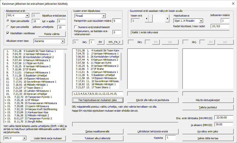 Uusi sääntö (2022): Kun karsinta ratkeaakin yksilökisana hiihdettyjen karsinta-aikojen summana, karsinnan osuussarjojen lähtölistat ovat ihan normaalit yksilösarjojen lähtölistat.