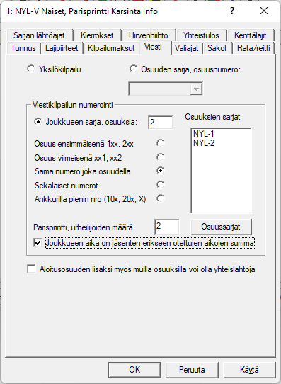 Lisätarkistuksena kannattaa vielä vilkaista, että osuuksien sarjoissa on oikea aloitusnumero, lähtöväli ja yhtäaikaa lähtijät. Itsellä vähän joskus tökki kun vähän liian pikaisesti yritin hommasta selvitä.