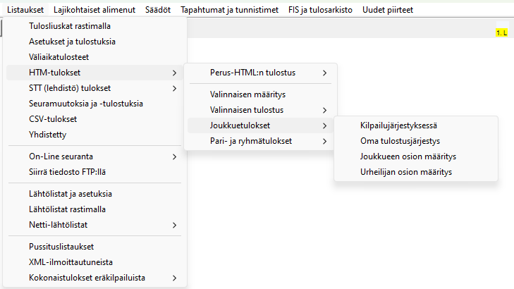 ExTimen 8-versioon tuli HTML-tuloksiin mukaan valmiiksi koodattu nettiin sovitettu tulostusformaatti. Siihen päästään käsiksi oikealla olevan kuvan esittämästä valikosta. Sarjojen tulostusjärjestyksen voi siis päättää. Syntyvä netti-sivu on kovakoodattu, tässä on linkki yhteen sen variaatioista. Sivun yläosaan käytetään kulloisenkin omavalintaisen HTML-tulostuksen määrityksessä annettua alkuosaa, esimerkissä Vantaan SM 2014 tulokset on tulostettu käyttäen Rukan SM 2015-kisojen 'headeria'. Joukkueen vaihtotilanteen kehitystä ja osuusaikojen tulostusta voidaan siis vaihdella kuten yllä on esitetty. Ja sama uutuus seuralogojen käytössä pätee parisprintissäkin, ihan kuin tässä ohjeessa on sanottu. |