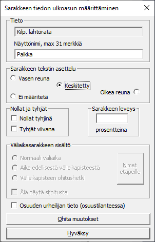 Ja tässä alla on sitten lähtörata-sarakkeen tarkemmat määrittelyt, näkyvää sarakeotsikkoa on vaihdettu ja kenttä tulostetaan keskelle. Tähän näyttöön päästään tuplaklikkaamalla kentän nimeä tai sitten painamalla nappia , kunhan kenttä on valittu keskellä olevasta listasta.