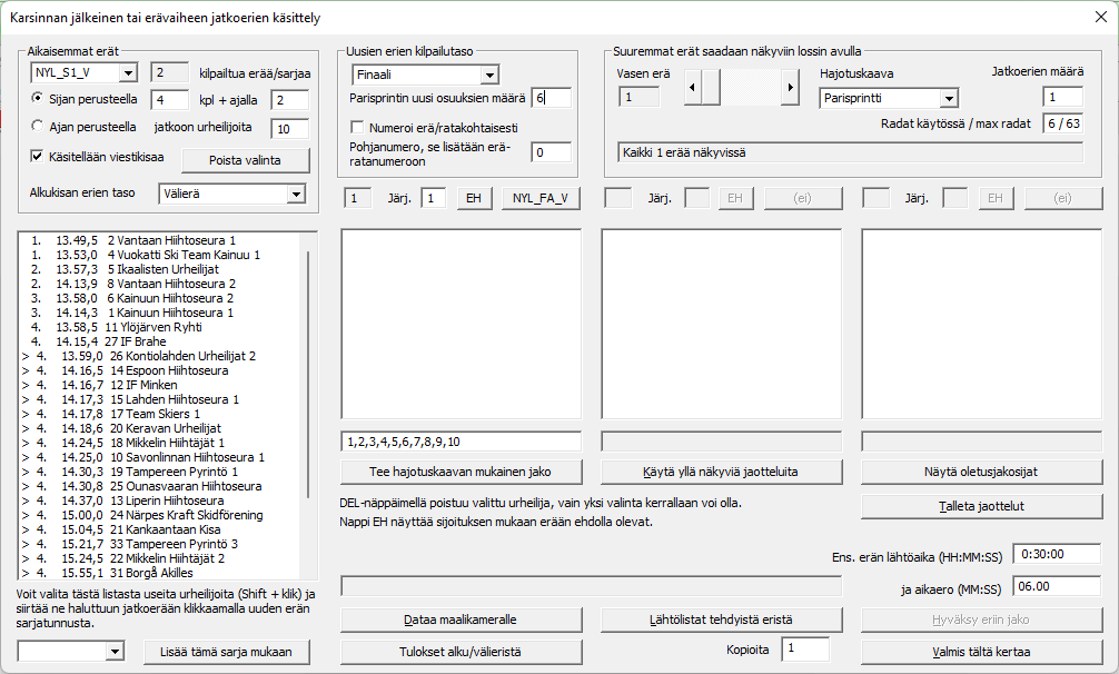 Vasemassa reunassa erätulosten listan ulkoasu muuttuu vaihtoehtojen ja perusteella. Periaate on pitää lista aina niin, että jatkajat ovat ylimpänä. Esimerkissä ensin erien ykköset, sitten kakkoset ja kolmoset ja siitä eteenpäin ajan perusteella järjestyksessä. Kentässä Parisprintin uusi osuuksien määrä on nyt 6, sillä Finaali on tarkoitus hiihtää kuusi-osuuksisena, kummallekin kolme osuutta. Tästä ExTime tietää perustaa Finaaliin kummallekin jäsenelle yhden osuuden lisää. Finaalin erän alle olen kirjoittanut valmiiksi erään sijoitettavien urheilijoiden sijaluvut 1,2,3,4,5,6,7,8,9,10 ja tallentanut ne napilla . Tämä siksi, että sama jaotus tulee toistumaan seuraavassa parispintissä Kuopiossa 6 kertaa. |