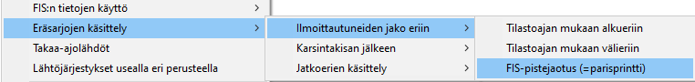 Osuuksia määrittelevällä rivillä on nappi , josta avautuvasta näytöstä ensin suoritetaan FIS-pisteiden haku (sama näyttö kuin parisprintin näytössä ) ja samalla summataan joukkueiden summapisteet (sama kuin ). Parisprinttisarjan lähtöaika ja -väli varmistetaan samaksi mikä halutaan ensimmäisen osuussarjan lähtöajaksi/väliksi. Järjestysvaihtoehdoista valitaan , sillä parhaan joukkueen urheilijat lähtevät ensin. Napilla saadaan joukkueet pisteidensä mukaiseen järjestykseen, joka sitten hyväksytään napilla . Kun joukkueiden lähtö on näin määritelty, asettuu ensimmäisen osuuden lähtöjärjestys samaksi kuin joukkueiden lähtöjärjestys. Sitä ei tarvitse enää käsitellä. |