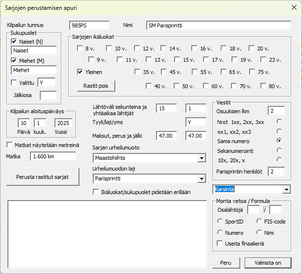 Parisprintin ilmoittautuneiden latauksessa KILMOsta on muistettava pari seikkaa. Normaalisti parisprintissä on kaksi urheilijaa, joista kumpikin hiihtää kolme osuutta. KILMOssa on seuran joukkuerivin jälkeen vain kaksi nimeä, ei kuutta (3 kertaa kaksi). Parisprinttisarjan perustaminen kannattaa tehdä wizardilla, Imatran 2025 perustamisen malli on oikealla. Seuraavat kentät kannattaa tarkistaa, wizardin kun palveltava sekä vanhaa että uutta kisaformaattia: