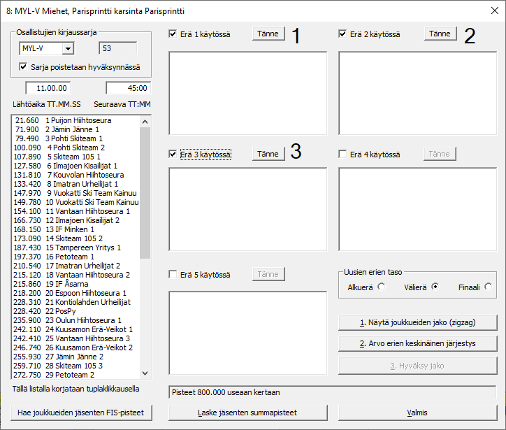 Aina ennenkuin siirrytään tekemään eriin jakoa on kirjattava joukkueiden kokoonpanomuutokset ja poistettava ne joukkueet, jotka ilmoitetaan poisjääneiksi. Kokoonpanomuutos vaikuttaa siihen, mihin erään joukkue sijoittuu. Jos joukkueen jäsenet vain vaihtavat keskinäistä hiihtojärjestystään, silloin tietysti pistesumma säilyy samana. FIS-koodi on välttämätön pisteiden poimintaa varten. ExTime-version 8 parannus on oma näyttö, jolla jaetaan joukkueet välieriin Hiihtoliiton uusissa säännöissä olevien lähtösuosituksen mukaisesti. Tämä löytyy valikosta , kohdasta / / . |