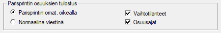 Parisprinttien tulostuksen hienosäätöä varten on ihan oma nappinsa , ja siinä kaksi ruksittavaa kohtaa , joka saa aikaa joukkueen tulosrivin alle tulostettavan joukkueen tilanteen kunkin osuuden jälkeen ja , joka taas tulostaa henkilökohtaiset osuusajat. Tämä näyttö on valikon kohdassa . ExTimen 8+versioissa on säädössä vielä yksi kohta lisää, se löytyy -valikon -näytön välilehdeltä .