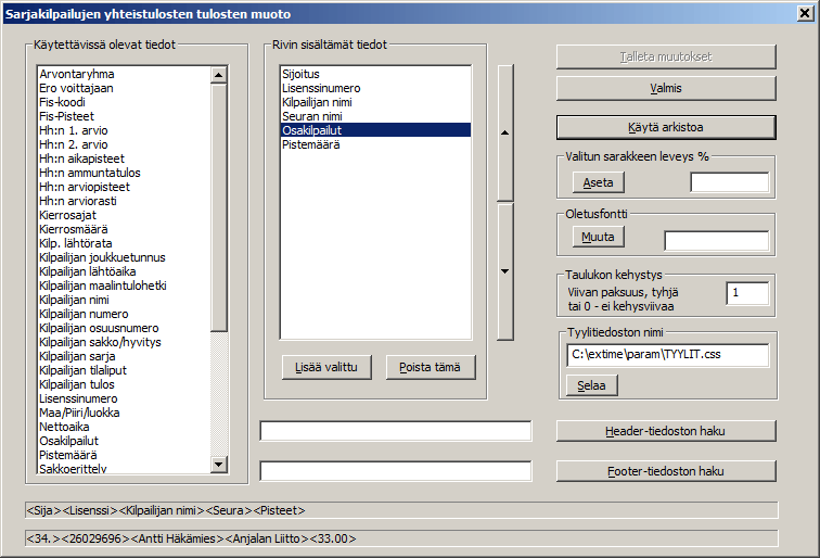 Napilla valitaan siis kilpailijasta tulostettavien tietojen sarakkeet, siitä alla lisää, ja napeilla ja valitaan tulostettavat sarjat ja niiden keskinäinen järjestys, aivan kuten ExTime-ohjelmassa muuallakin valitaan.