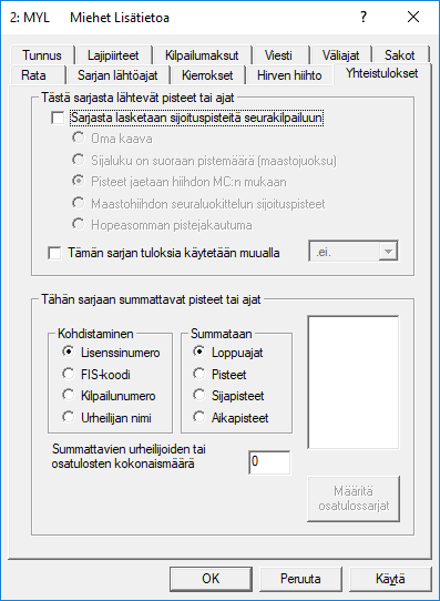 Osakilpailun nimi haetaan ko. kilpailutiedostosta kisan nimi kentästä (=sarjan nolla nimi). Jos yhteistuloksen ratkaisee aikojen summa, on osatulos sarakkeella sen kilpailun aika ja sijoitus, tässä esimerkissä on kisasta saatu MC-pistemäärä ja osakilpailun sijoitus.