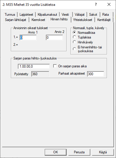 Tällä välilehdellä määritellään kilpailtava sarja hirvenhiihto- tai hirvijuoksu-kilpailuksi. Kilpailutavasta on oma ohjeensa t ll . Oikean reuna pallukoilla valitaan, onko kilpailu normaali (), tupla-arvioinnilla () vai ilman ajanottoa (kävellen) käytävä kisa (). Ja siis jos sarja ei ole hirvenhiihtokisa, täppä on kohdassa , se yleisin vaihtoehto. ja kenttiä ei tarvitse täyttää, jos kilpailussa annetaan arviopaikat lähtönumeroiden perusteella. Jos sarjassa on vakio arviointipisteet, ne annetaan tässä. Normaalikisassa annetaan n kyy vain yhdet arviot, esimerkin kisassa arvioidaan kahdessa eri kohdassa. Tuplakisassa sarjan paras aikatulos saattaa antaa 600 pistettä, siksi parhaat hiihtopisteet sarjaa kohti voidaan antaa erikseen, normaalikisan 300 on oletus. Tämä tieto laitetaan siis kenttään . Sarjaan voidaan laittaa myös erilainen kuin mitä sarjassa on saavutettu. Tätä tarvitaan jossain sääntötulkinnan erikoistapauksessa. Täppä osoittaa, onko aikaa käsin muutettu paremmaksi (täppä puuttuu silloin) vai onko aika ko. sarjan paras aika. Esimerkissä on siis käsin annettu ajaksi tasan tunti. |