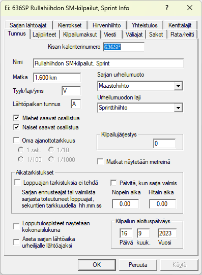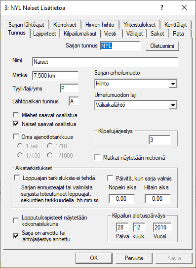 Valikon toiminnolla klikkaamalla näyttöön tulee sarjan, jonka kilpailujärjestys on nolla (=kilpailun perustiedot), tiedot. Näytössä on, aivan kuten jatkossa kaikissa sarjoissakin, usean välilehden muodostama tietojen kokonaisuus. Näistä välilehdistä kilpailun perustietojen kannalta merkityksellisiä ovat , ja . Kun kilpailuun lisätään uusia sarjoja, otetaan perustiedot kilpailun perustiedoista, jos ei erikseen ole valittu mitään muuta sarjaa referenssisarjaksi. Sarjatunnuksen paikalla on kilpailun perustiedoissa , eli numero Hiihtoliiton tai FISin kilpailukalenterissa, tämä tieto otetaan kisasta tehtäviin XML/CSV-välitystiedostoihin yksilöimään kilpailutapahtumaa. -kentän tieto tulee tulosliuskoihin kilpailutapahtuman nimeksi. valintavaihtoehdoista valitaan urheilumuoto, ja sen alapuolelta vielä tarkempi laji , jonka mukaan säätyy kilpailun oletusarvot. Näitä pääsee toki tarkemmin muuttelemaan tarvittaessa sarjakohtaisestikin välilehdellä. Sarjan tunnuksesta johdetaan tieto siihen, saako sarjassa kilpailla miehet, naiset vai molemmat. |