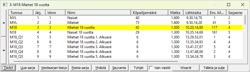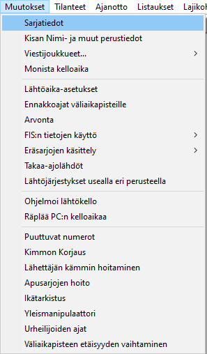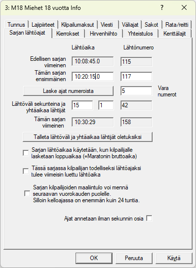 Jos haluat muuttaa useamman sarjan lähtöaikoja samalla kertaa, käytä -valikosta löytyvää näyttöä . Mutta kuten tuossa totesin, olen itse siirtynyt käytäntöön antaa lähtöajat arvonnan yhteydessä. Näin pääsen rytmittämään kilpailua paremmin kun sarjakohtaiset osanottajamäärät on näkyvissä, lisäämään sopiviin kohtiin enemmän makkaran myyntiaikaa ja varmistamaan ladun olevan tyhjä riittävän kauan ennen pääsarjan lähtöä ja saamaan pääsarjat lähtemään tasatunnilta tai -vartilta. |