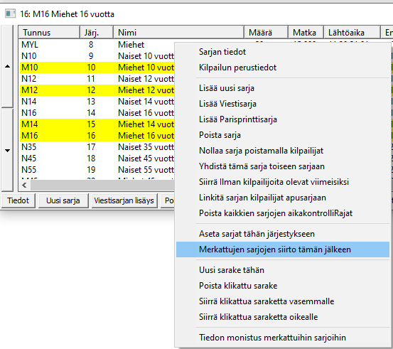 Tuossa oikealla olen valinnut poikien sarjoja . Lopputuloksena valitut sarjat siirtyivät sarjan MYL jälkeen ennen sarjaa N10. Näin saat helposti muokattua sarjaluettelon kilpailujärjestykseen. Vasemman reunan nosturilla voit aina vaihtaa yhden sarjan paikkaa. Toinen hyvin käyttökelpoinen on . Siinä valitaan ensin ne sarjat, joihin tieto kopioidaan ja sitten klikataan kopioitavan tiedon sisältävän sarjan rivillä juuri sitä monistettavan tiedon sarakketta. Sarjojen valinta on normaali windowsin valinta, Ctrl painettuna valintaan lisätään yksittäinen sarja, Shift painettuna kaikki siitä väliltä. |