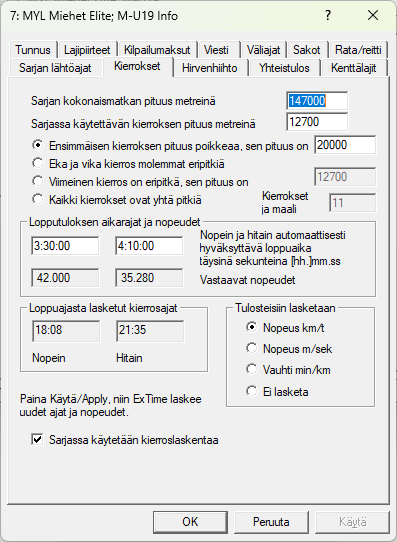 Luistelun myötä tein oman välilehden kierrosten määrittelyyn mutta enemmän sitä käytetään pyöräilykisoissa. Siinä yritän myös mahdollistaa kierroslaskennan käyttöä maastojuoksukilpailuissa ja yleisurheilun ratajuoksuissa. Esimerkkikuva on elokuun lopussa 2023 käyty SM-pyöräilykisa. Kierrospituuden määrittelyssä on peräti neljä vaihtoehtoa, eli kisa voisi alkaa jossain avaralla paikalla, josta rata kulkee maastoon vakio lenkille. Tätä kierretään useampi kerta ja sitten kiritään maaliin jonnekin muualle kuin lähtöpaikalle, vaikka kauppatorille. Tällaisessa tapauksessa valitaan vaihtoehto ja annetaan esim. ekakierroksen pituudeksi 700 metriä ja viimeisen kierroksen pituudeksi 300 metriä ja peruskierros olisi sitten se pururadan pituus 1800 metriä. Ja kun peruskierros mennään 5 kertaa, tulee koko matkan pituudeksi 700 + 5 * 1800 + 300 = 10000 metriä eli 10.0 km. Esimerkkikuvassa on ensin ajettu 20 km lenkki ja loput 10 kierrosta ovat olleet 12.7 km. Vastaavasti 1500 metrin juoksussa poikkeaa peruskierroksesta, urheilija leikkaa maaliviivalla olevan kennon 300 metrin, 700 metrin, 1100 metrin ja maalissa 1500 metrin kohdalla, maalilinjan (=kelloajan liipaisun) ylityksiä tulee siis yhteensä 4. Kuvakaappauksessa näkyy myös kierrosajoille tehtävien aikatarkistuksen rajat. Nopeimmaksi loppuajaksi on annettu kolme ja puolituntia ja hitaimmaksi neljä tuntia 10 minuuttia. Näistä -napilla ExTime laskee tuolle 12.7 kilometrin kierrokselle raja-ajoiksi 18 minuuttia ja 21 minuuttia, joita vastaavat nopeudet ovat 42 km / tunnissa ja 35.2 km / tunnissa. Tällä Kierrokset-välilehdellä määritetään myös, miten sarjan tuloksiin tulostetaan nopeus, jos se on valittu tulostettavaksi tiedoksi. |