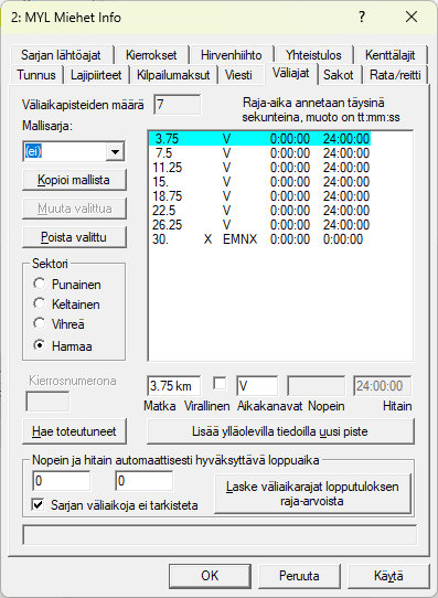 Napilla lisätään uusi väliaikapiste, arvojen on oltava silloin jo syötettynä. Jos sama matka löytyy jo ennestään, sen aika- ja tunnuskentät vaihdetaan uusiksi arvoiksi. Toiminta on sama kuin mitä tekee nappi . Se aktivoituu, kun em. kentissä on tapahtunut muutoksia. -nappi poistaa valitun väliaikapisteen. -nappi hakee yläpuolella olevassa valinnassa valitusta sarjasta sen väliaikapisteet myös tämän sarjan väliajoiksi. Niitä voi sitten muokata tämän sarjan urheilijoiden vauhtiin sopivaksi. |