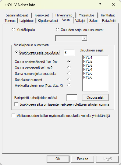 Tällä välilehdellä määritellään kilpailtava sarja viestikilpailuksi tai parisprintiksi. Äskeisten linkkien takaa löytyvät tarkemmat ohjeet. -välilehdellä asetetaan urheilulajiksi siis joko Viesti tai Parisprintti. Sarjatyypin pallukka voi olla kolmessa eri kohtaa