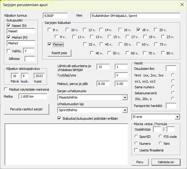Ensimmäinen asia, joka pitää tehdä, on antaa kilpailun perustiedot (kisan nolla-sarja). Uuden kilpailun aloittaminen tapahtuu -valikon kohdasta . Aloitusvelhon alaosassa on myös nappula , tällä napilla päästään käyttämään sarjojen perustamisen apuria, tuossa alla on ohjeet.