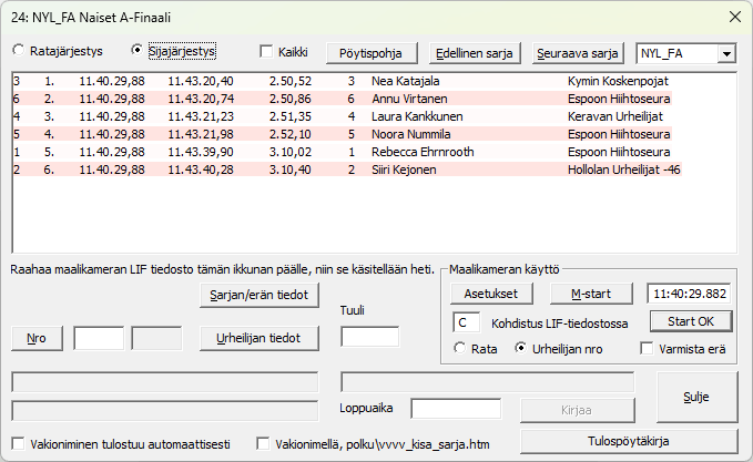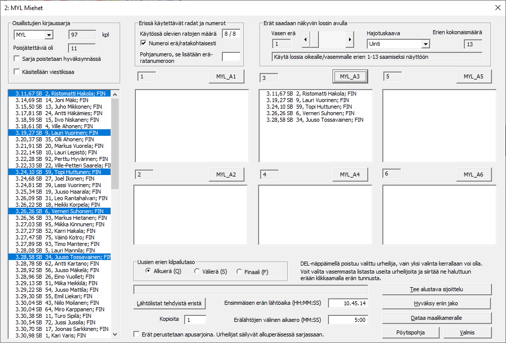 Olisin voinut myös valita ensin 6 parasta karsinnan listasta ja sitten klikata erän tunnusta N14_FA siirtääkseni valitut 6 urheilijaa A-finaaliin. Valinnat siirron jälkeen saa pois napilla . Valintoja voi tehdä myös yksitellen ja siirtää vaikkapa sama urheilija toiseenkin erään, vain viimeinen erävalinta pätee yhtä urheilijaa kohti. Varaa virhenäppäilyyn siis on.