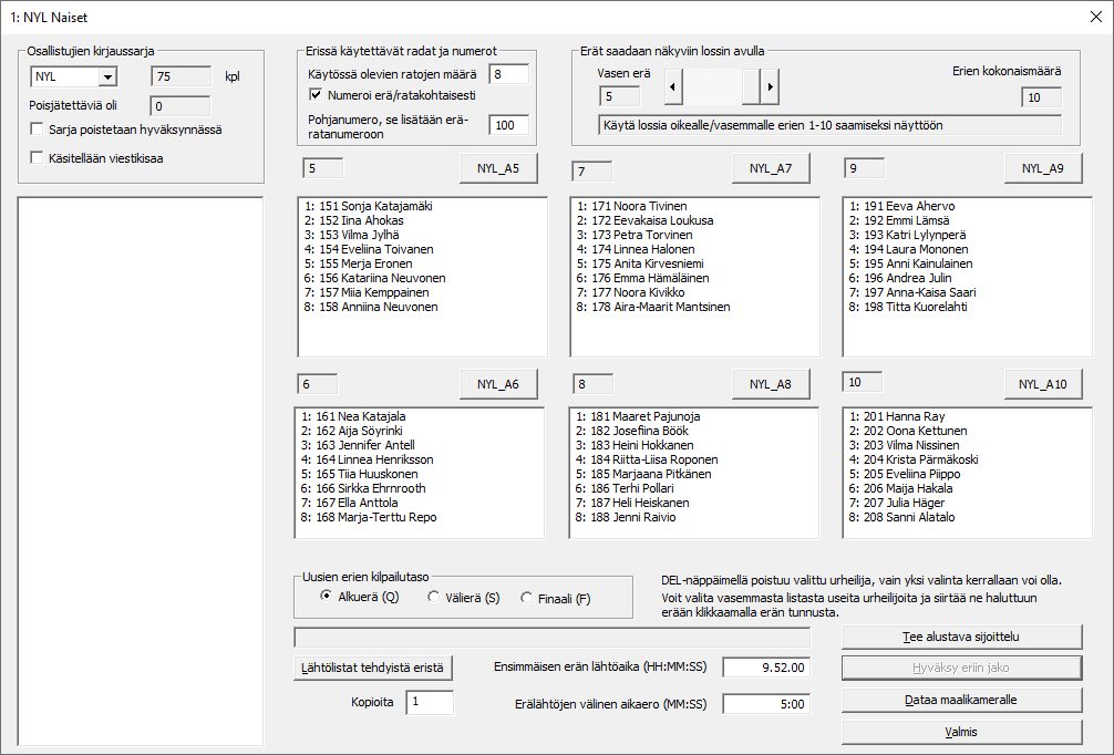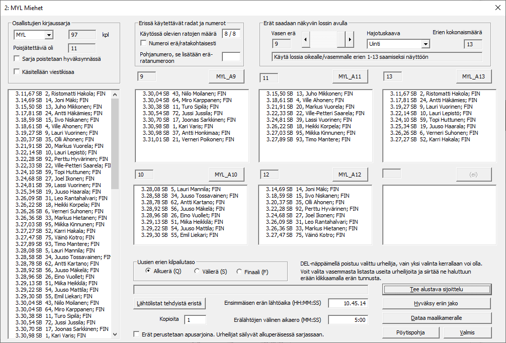 Erän arvioitu lähtöaika ja erien aikaväli sekä erävaiheen codex-numero käsitellään kuten yllä, samoin mahdollinen lähtölistojen teko ja lopuksi erien valinta hyväksytään . |