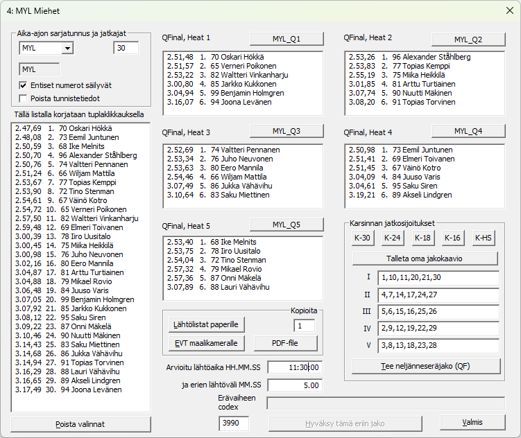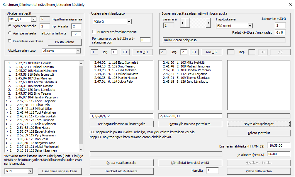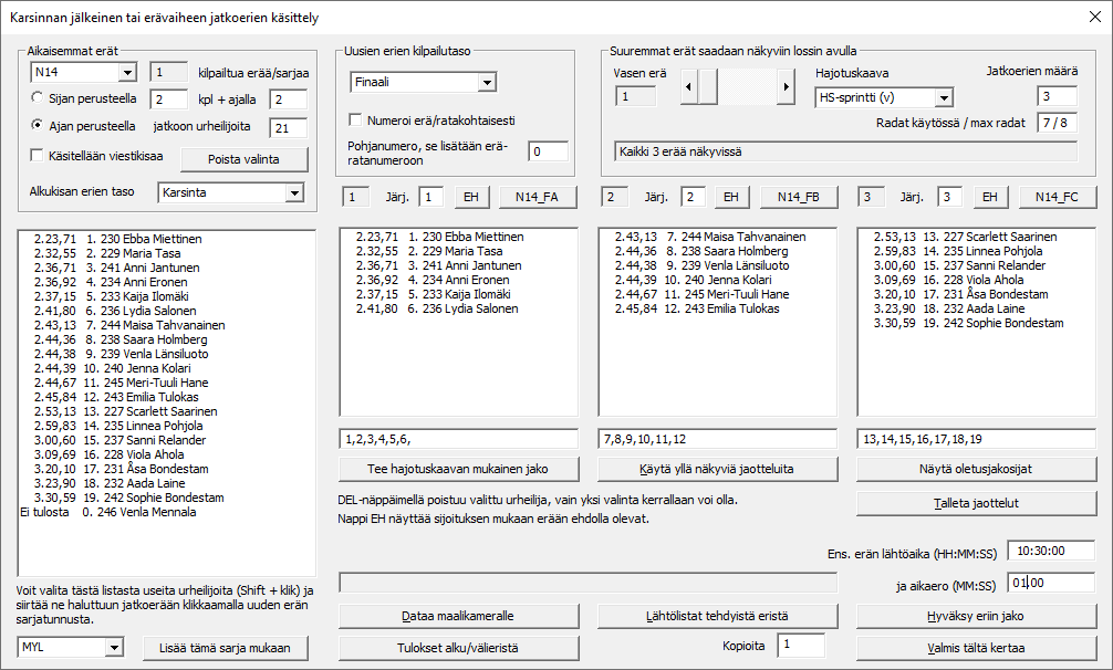 Vasemman reunan lista on karsinnan aikojen mukainen ja olen tallentanut kunkin jatkoerän (suora Finaali) alle siihen erään menevien urheilijoiden sijaluvut. Nyt saan eräjaon tehtyä yhdellä napilla .