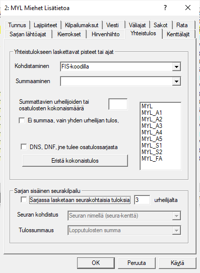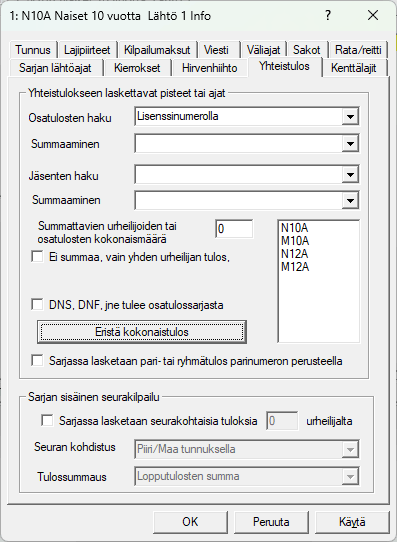 Pienissä osanottajamäärissä kannattaa karsinnat hiihtää omina sarjoinaan ja sitten valikoida erävaiheeseen useampia sarjoja samoihin eriin. Sprintin kokonaistuloksissa saadaan kyllä alkuperäiset karsintasarjat esiin ja myös samansarjalaisten suhteelliset sijoitukset. Monta eri karsintasarjaa saadaan kytketyksi yhdeksi sarjaksi erien muodostukseen merkkaamalla sarjan tiedoissa -välilehdellä napilla sarjat yhteen eräkokonaisuuteen kuuluviksi. Sarjan tietoihin päästiin käsiksi valikon kautta, kun avautuvassa listassa tuplaklikataan haluttua sarjaa. Muutos tarvitsee tehdä vain yhteen sarjaan (N10A), muut (M10A, N12A, M12A) saavat muutoksen samalla kertaa. Toki jokaisen sarjan perustiedoissa (välilehti ) pitää olla rastittuna kohta, että . Tämä tieto menee oletuksena, kunhan sarjan lajiksi (välilehti ) on merkitty joko sprinttihiihto, parisprintti, XCX tai Formulahiihto. Ja laji annetaan myös jo sarjoja perustettaessa wizardissa tai kisan yleisissä tiedoissa. |