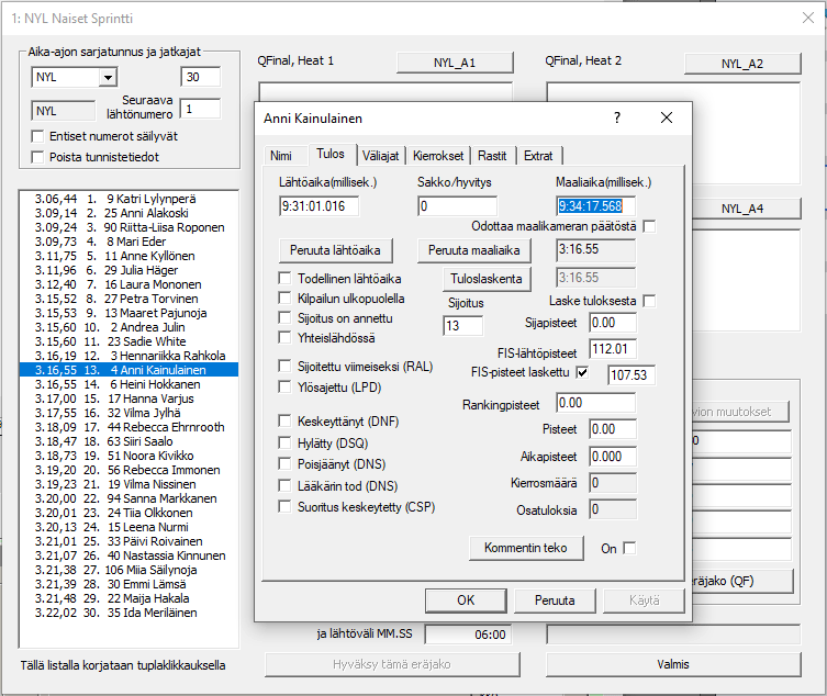 Esimerkin kuva ei ole Tampereelta vaan se on vanhemmalla versiolla tehty ajat sitten. Samaa sijalukua ei enää oikeastaan esiinny sprintin karsinnassa, jos karsintasarjan asetuksissa on laitettu oikein tasasijoitukset ratkaiseva tieto. FIS:n säännöissä se on FIS:n lähtöpisteet, niin että saman ajan karsinnassa hiihtäneistä paremmaksi katsotaan urheilija, jonka FIS-pisteet ovat paremmat, eli pienemmät. Oikean puolen esimerkissä näkyy, miten urheilijan tietoja voidaan korjata, jos vaikkapa saman sijan hiihtävät urheilijat, joilla kummallakaan ei ole vielä FIS-pisteitä. Annila ja Heinillä on sama aika (ei todellinen tilanne). Valitsin Annin tuplaklikkaamalla ja sain kilpailijan tarkat tiedot näkyviin. Valitsin välilehden tulos, ja tarkistan FIS-lähtöpisteet (112.01). Sama tehdään sitten Heinin kohdalla (134.45) ja toteamus on, ettei ole aihetta muutoksiin. |