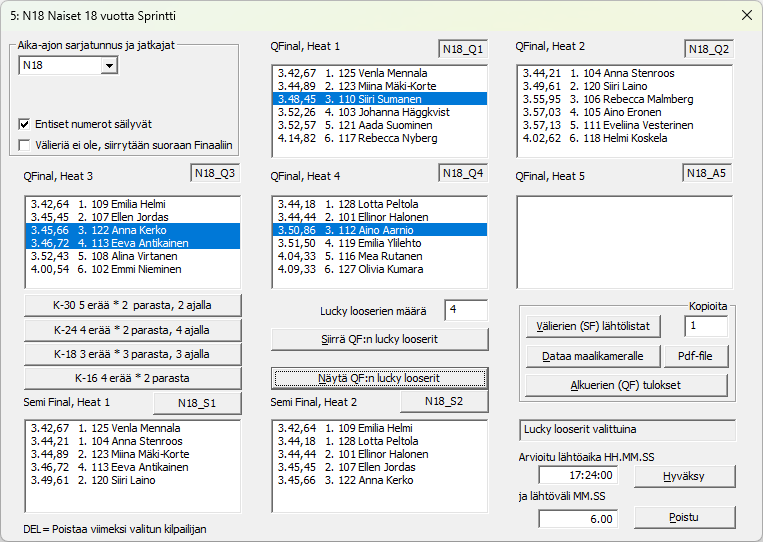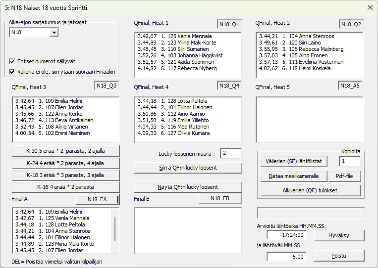 FIS-välierissä alku on sama, ensin valitaan karsintasarja (aika-ajosarja), numeroinnissa on nyt oletuksena samojen numeroiden säilyminen. Tässä esimerkissä on kuvassa Tampereen 2024 FIS-kisojen N18-sarjan välierät, joissa käytettiin 24 urheilijan kaaviota, eli 5. erä puuttui kokonaan, joka aiheuttaa muutoksia lucky loosereiden käsittelyyn. Muutos näkyy siinä, että alkuerässä 5 ei ole yhtään kilpailijaa ja sen sarjatunnus on N/A. Kuten edelläkin eräjako voidaan tehdä yhdellä napin painalluksella karsintasarjaan etukäteen kiinnitetyn jakokaavion mukaan (alun numero on alkuerämäärä): Kaikki sarjan perustamiset ja urheilijoiden kopioinnit tehdään kisatiedostoon vasta kun näytössä näkyvä tilanne hyväksytään napilla . Ja sama periaate toimii kuin alkuerissäkin, mitään ei tarvitse peruutella, jos eräjakoa ei hyväksytä. Ja samoin välierien ohjeellinen aikataulu voidaan myös asetella paikalleen. |