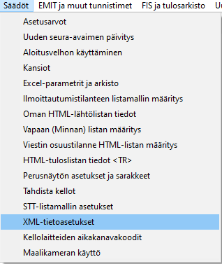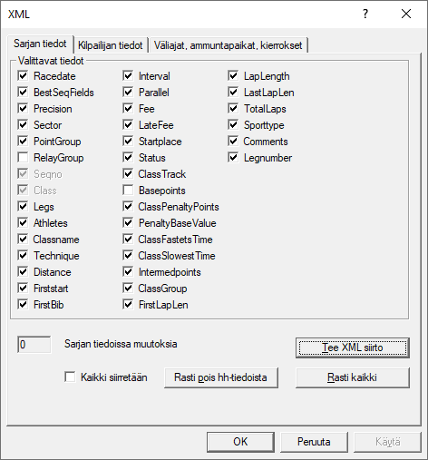 Päivitettyjen ja lisättyjen sarjatietojen siirtymiseksi kisan aikana kuuluttajalle/toimistoon eli muille ExTime-koneille tulee varmistaa, että riittävä määrä siirrettäviä tietoja on merkitty XML-tietotaulukkoon. Sinnehän päästään -valikon kautta. Varminta on rastia kaikki, kuten oheisessa esimerkissä. Etukäteen asetettavia tietoja on jatkoon pääsevien lukumäärät, käytettävät erien tunnukset sekä sijoituskaaviot. Niitä säädetään samaisen -valikon toiminnolla ja siellä välilehti . Aikaisemmin välilehden nimi oli Sprintti, mutta asetusarvot koskevat kaikkia eräkilpailuja, siis kilpailuja, joissa on vaihteleva määrä alku- ja välieriä kaiken huipentuessa Finaaleihin. |