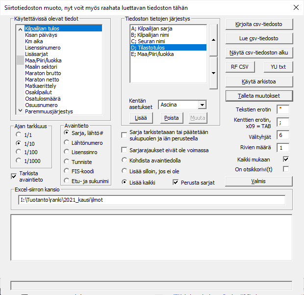 Sitten vain raahataan maalikameran kansiosta erän aikojen lif-tiedosto tämän ikkunan päälle. Jos erästä on tehty maalikameralle evt-tiedosto, kannattaa oikea erä varmistaa rastimalla oikean reunan -ruutu. Tässä kuvassa on sitten lopputilanne, myös urheilijan lähtöaikaa on muutettu. Maalikameran käynnistysaika on merkattu kaikille erän hiihtäjille lähtöajaksi ja sama aikamäärä on myös lisätty urheilijan maaliaikaan. Yläreunan palloilla ja voi sitten tilannetta tarkastella eri tavoin. |