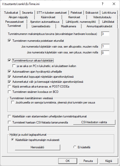 Toinen säädettävä paikka on valikossa , välilehdellä . Siinä voidaan halutessa rajata ExTimen käyttämää tunnistimen numerosarjan pituutta, kohdan alla on kaksi ruutua, käytettävän osan alkupositio ja pituus. Näitä käytetään, jos ne ovat nollasta poikkeavat. aiheuttaa sen, että tunnistimelta saatu aika laitetaan urheilijalle väli- tai loppuajaksi. Tämä edellyttää tietysti, että tapahtuman aikakanava- ja aikarajatarkistukset läpäisevät asetetut ehdot. Kun kohdassa ei ole rastia, ei onnistuneista väliaikakirjauksista tule näyttöön tietoa ja vastaavasti taas kun kohdassa on rasti, ajanottaja saa näyttöönsä kaikki loppuajat. Rastin puuttuessa näyttö pysyy tyhjänä. Kirjatut ajat saa -näppäimellä nopeasti pois ruudusta. Valinnaisena varsinkin hiihdossa on kohta . Tämä tarjoaa mahdollisuuden ottaa tarkka aika valokennolta tai painonapilta ja käyttää tunnistinlukijan tietoa vain yksilöimään urheilija. Aika täytyy silloin erikseen hyväksyä urheilijalle. Aika voi olla tunnistimen lukijan sisäisen kellon antama aika tai se aika, jolloin ExTime saa tapahtuman lukijalta. |