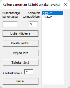 Oletettavasti uRTimen lukija toimii luotettavasti ja poimii jokaisen urheilijan tunnistimen numeron urheilijan ohittaessa lukijalankun. Tähän perustuen jätin ohjeiden alussa väliaikapisteitä määritettäessä aikatarkastukset tekemättä. Jokainen uusi urheilijan väliaika halutaan menevän seuraavan väliaikapisteen väliajaksi ja viimeinen loppuajaksi. Jotta tämä onnistuisi varmasti, määritetään jokainen käytettävän uRTimen lukijan aikakanava tähdeksi, eli jokeriaikakanavaksi. uRTimen lukijan ExTimelle lähettämässä sanomassa on lukijan numerokoodi ja tämän numerokoodin arvoksi laitetaan nyt siis tähti (*)-merkki, oheisessa esimerkissä lukijan numero 22 koodi muutetaan näin jokeriaikakanavaksi. (Itseasiassa uRTime ei lähetä sanomia ExTimelle, vaan ExTime lukee uRTimen kirjoittamaa lokitiedostoa.) Kyseinen säätöikkuna löytyy ExTimen valikosta alimmaisimpana, . |