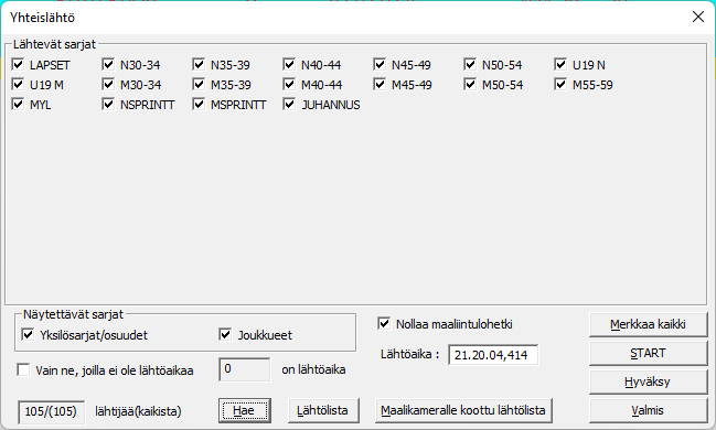Normaalistihan triathlon kisan lähtö on yhteislähtö, joko kaikki sarjat kerralla tai nopeimmat sarjat ensin ja hitaimmat muutaman minuutin viiveellä ns. aaltolähtöinä. Toteutunut lähtöaika reksisteröidään ExTimen näytöllä , joka on valikossa . Näytössä rastitaan lähtevät sarjat (esimerkissä kaikki lähtivät samaan aikaan), painetaan nappia , jolloin lähtijöiden määrä voidaan varmistaa (esimerkissä 105 lähtijää) ja lähtöhetkellä painetaan nappia . Lähtöaika ilmestyy -napin vasemman puolen ruutuun, jossa sitä voidaan vielä korjata (jos nukuit lähtöhetkellä). Jos taas olit liian aikaisessa, paina -nappia uudelleen todellisella lähtöhetkellä. -napilla ruudun lähtöaika menee jokaiselle rastittujen sarjojen kilpailijoille. Nyt voidaan rastia uudet sarjat, jos oli aaltolähtöjä ja toistaa , ja nappien painamiset. napilla näyttö menee kiinni. napilla saadaan kaikki sarjat rastituiksi yhdellä kertaa. |